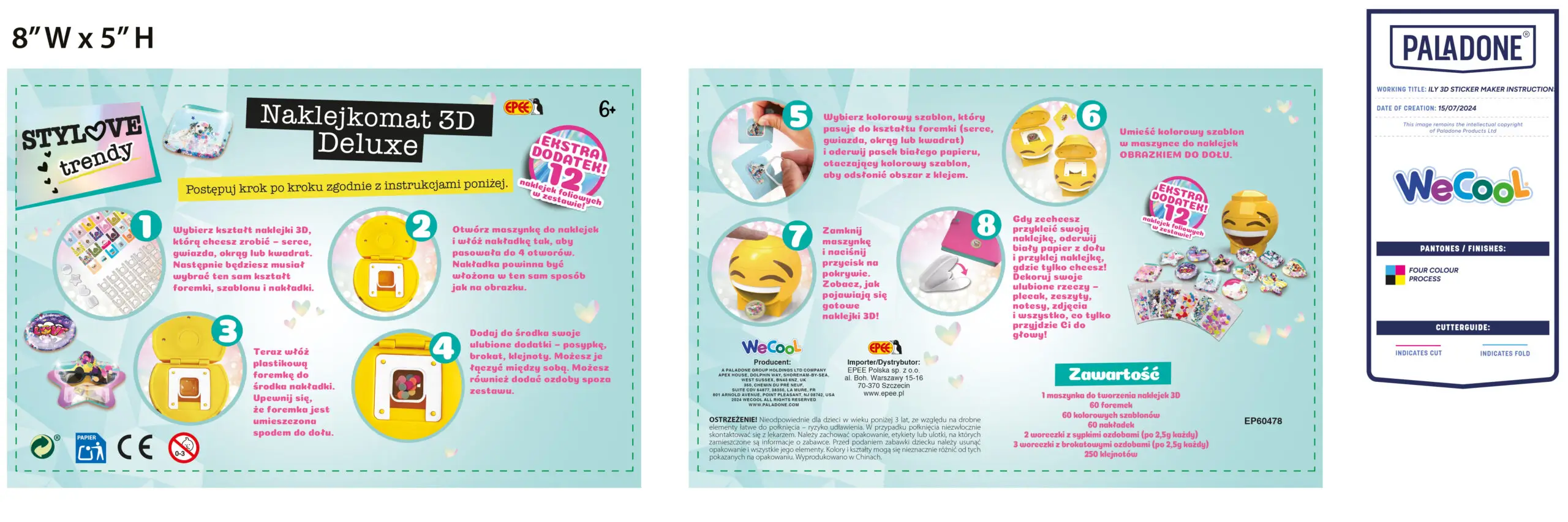 Zaprojektowanie własnej naklejki jeszcze nigdy nie było tak proste – i tak efektowne! Wybierz tło, dodaj odrobinę brokatu, posypki lub kryształków, umieść wszystko w urządzeniu, naciśnij i… gotowe! Trójwymiarowa naklejka jest gotowa, by ozdobić Twój rysunek, zeszyt, plecak czy prezent dla przyjaciela.